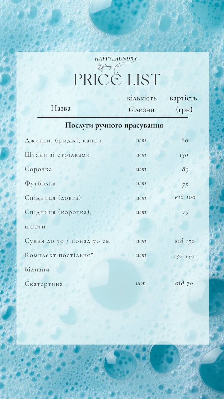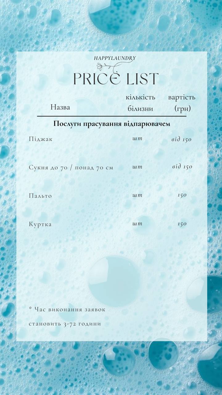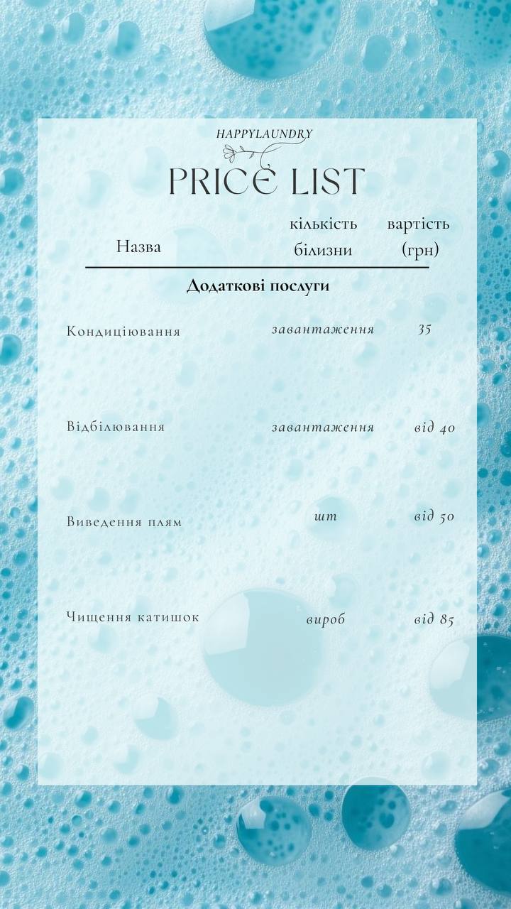 Happy Laundry Чернигов — быстро, чисто, без стресса! Текст: Вы устали от долгой стирки и хлопот по чистке вещей? Happy Laundry здесь, чтобы помочь! Стираем и чистим постельное белье, текстиль, куртки, одеяла, матрасы, мягкую мебель, шторы и т. д., гладим и отпариваем — использование продуктов без фосфатов. Время выполнения — от 4 до 24 часов. Мы предлагаем: & бык; Акции и скидки для постоянных клиентов; & бык; Каждая 10-я стирка или чистка — бесплатно; & бык; Большой выбор ароматов для кондиционеров; Позвоните или оставьте заявку — вернем вещи чистые и свежие!