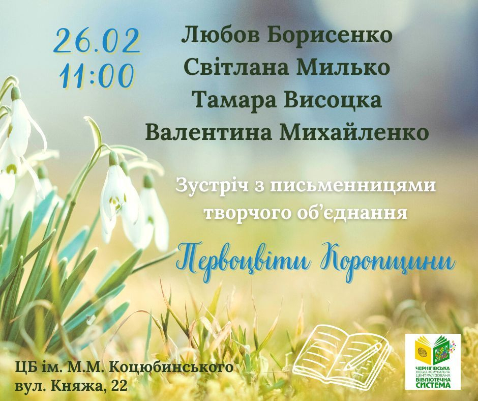 26.02 о 11:00 запрошуємо на зустріч-знайомство з письменницями творчого об’єднання “Первоцвіти Коропщини”. До Центральної бібліотеки ім. М.М. Коцюбинського завітають Валентина Михайленко, Любов Борисенко, Тамара Висоцка та Світлана Милько. Письменниці презентують свої книжки, видані минулого року.