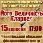 15 вересня 2013 року о 17.00 в обласному філармонійному центрі фестивалів та концертних програм відбудеться V Всеукраїнський фестиваль інструментальної музики «Його Величність Кларнет». П'ятий рік поспіль до Чернігова приїжджають відомі музиканти з України. Фестиваль передбачає концертну програму, обмін досвідом, спілкування де відкриваються нові імена та звучить жива музика. У фестивалі братимуть участь кращі інструменталісти України. ...
