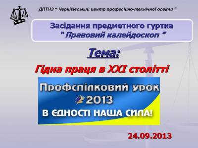 24 березня 2013 року в Чернігівському центрі професійно–технічної освіти відбулось розширене засідання предметного гуртка «Правовий калейдоскоп», керівник Губко Ю.М. Колектив центру ПТО співпрацює з федерацією профспілкових організацій Чернігівської області. Традиційним стало проведення уроку «Профспілки – захисники наших прав»....